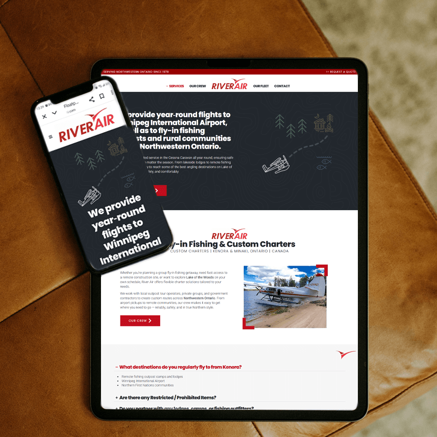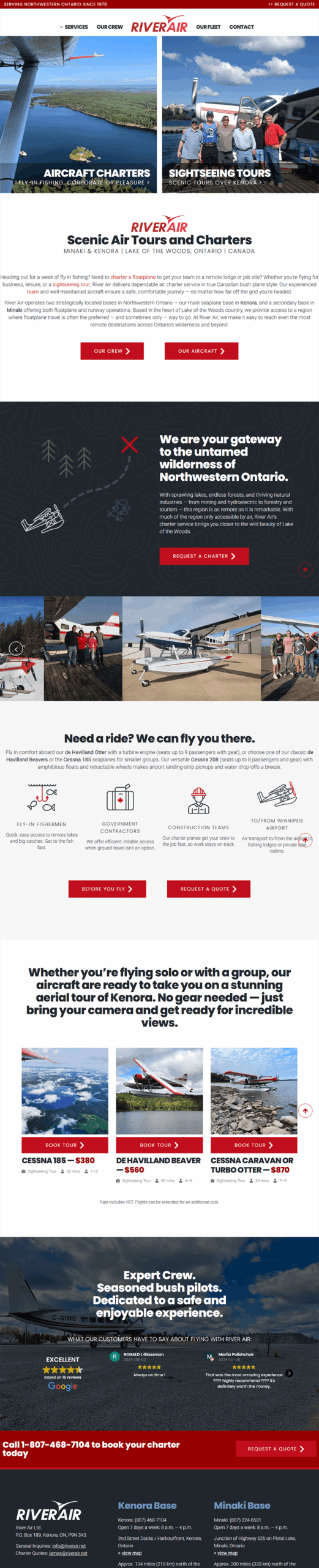 WordPress website for River Air in Kenora, ON, featuring modern graphics, icons, and floatplane sketches of their fleet for a distinctive, approachable look. The site balances bold design with practical functionality, including custom flight request forms and location maps. The result is a clean, user-friendly platform that helps customers explore routes and book flights with ease.